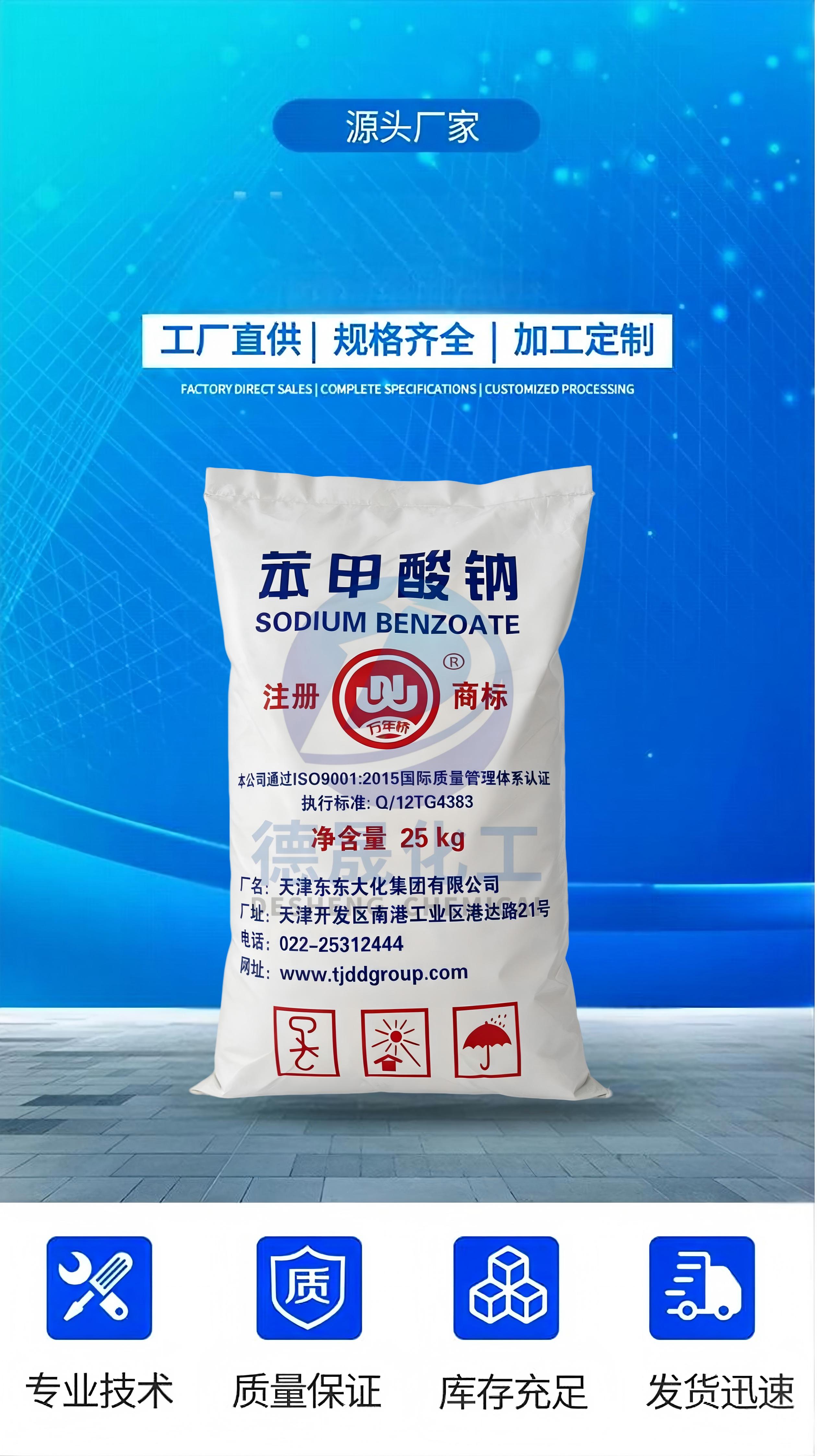 关键特性:酸性条件(pH 2.5–4.0)下可转化为苯甲酸,抑菌 / 防腐效果显著;碱性环境几乎无效;与强酸反应析出苯甲酸;